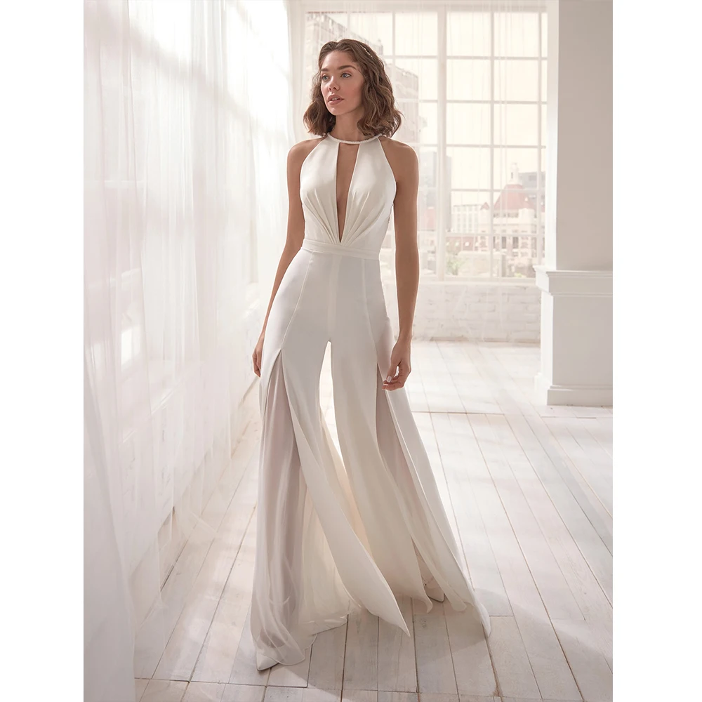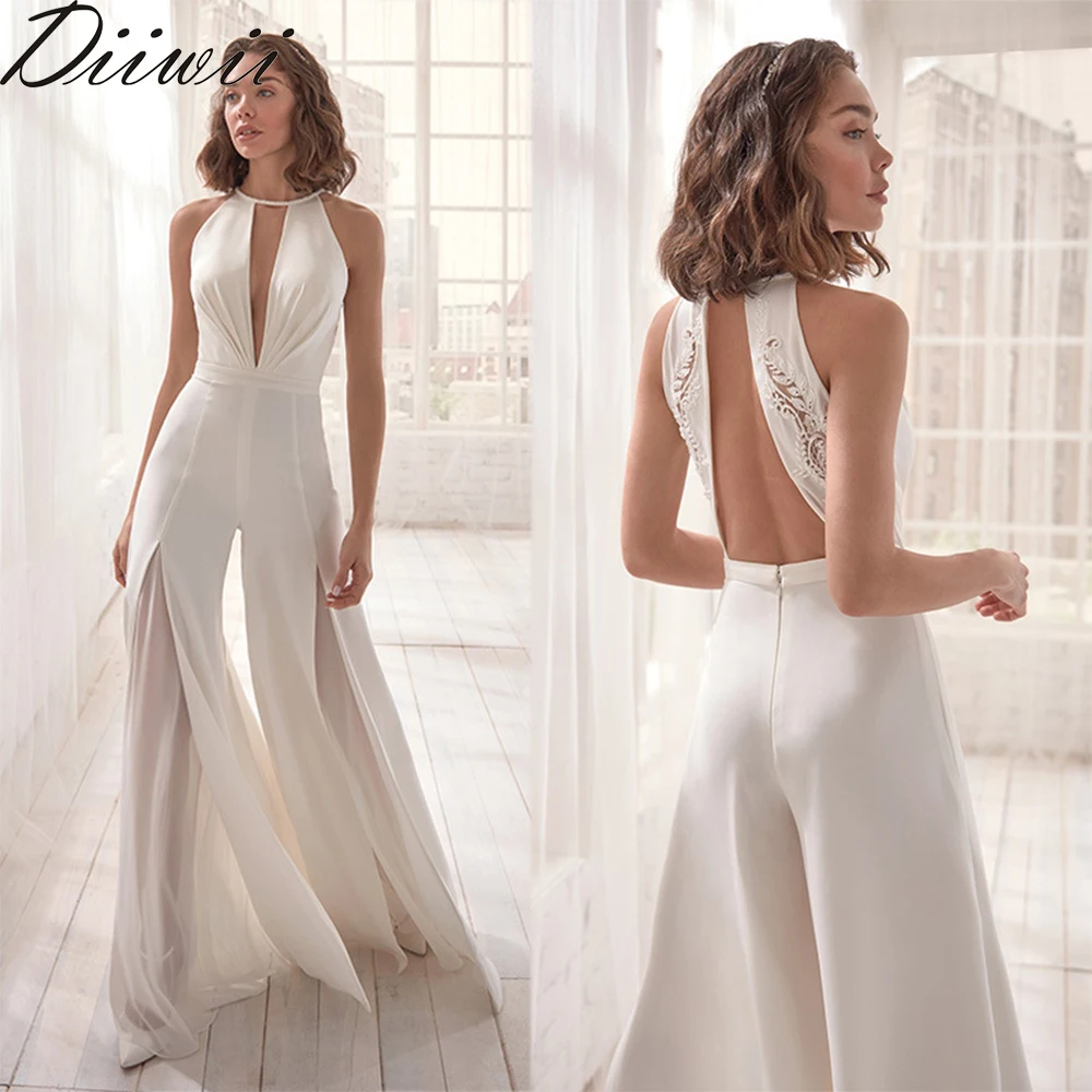 Diiwii Women Jumpsuit Deep V Neck Sleeveless Halter Rompers Backless White Elegant  Sexy Female Lady Girl With